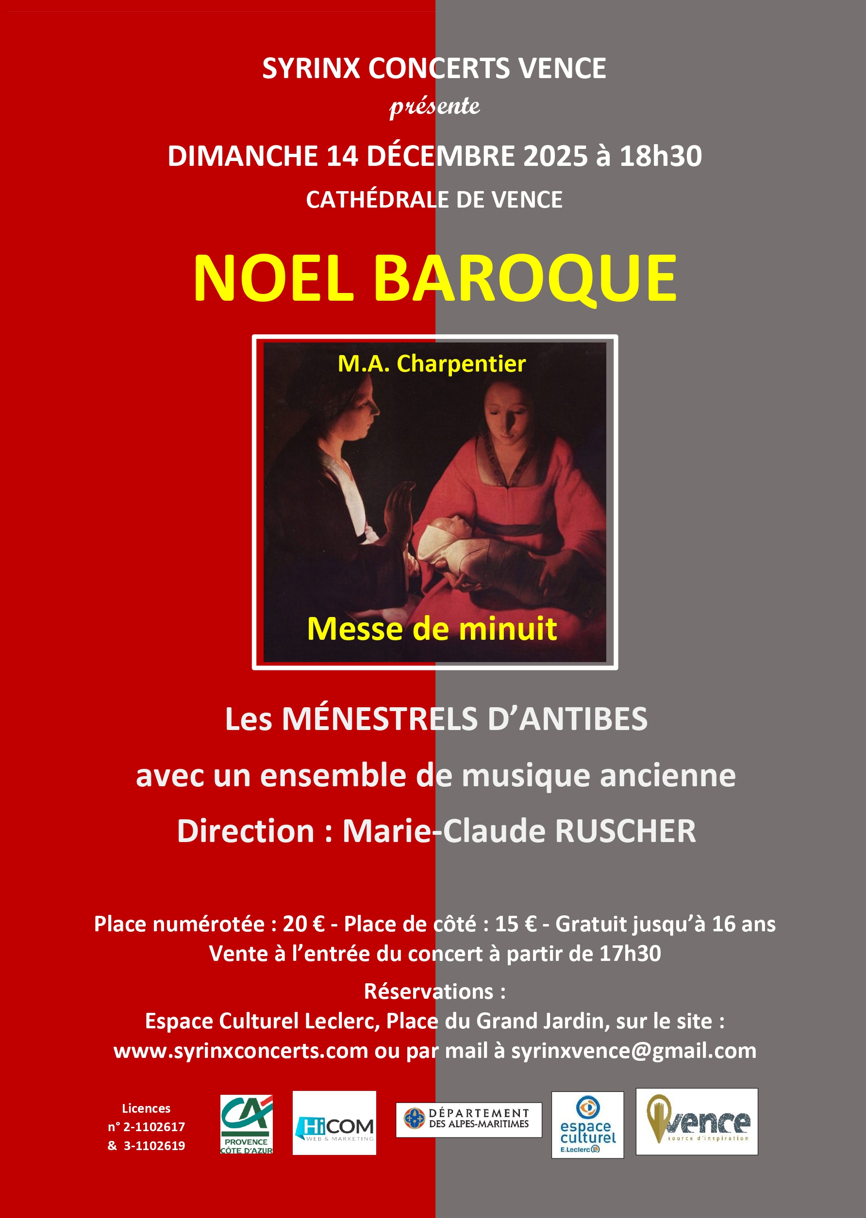 Pour célébrer la magie de Noël, Syrinx Concerts Vence vous invite à une soirée d’exception placée sous le signe de l’émotion, de la tradition et de la splendeur baroque.